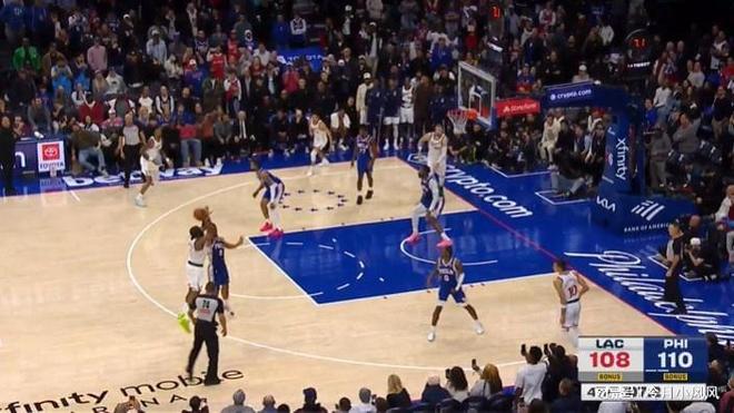 比赛还剩1分44秒时,76人中锋德拉蒙德在身边一米范围内没有明确防守者的情况下在禁区待的过久,应该吹罚防守三秒违例,快船得到一次罚球机会。