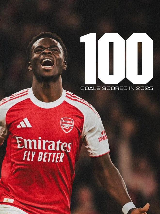 赛后来自阿森纳官方的统计指出,算上本场比赛梅里诺和萨卡的两粒进球,他们2025年在正式比赛中已经打进了100粒进球。